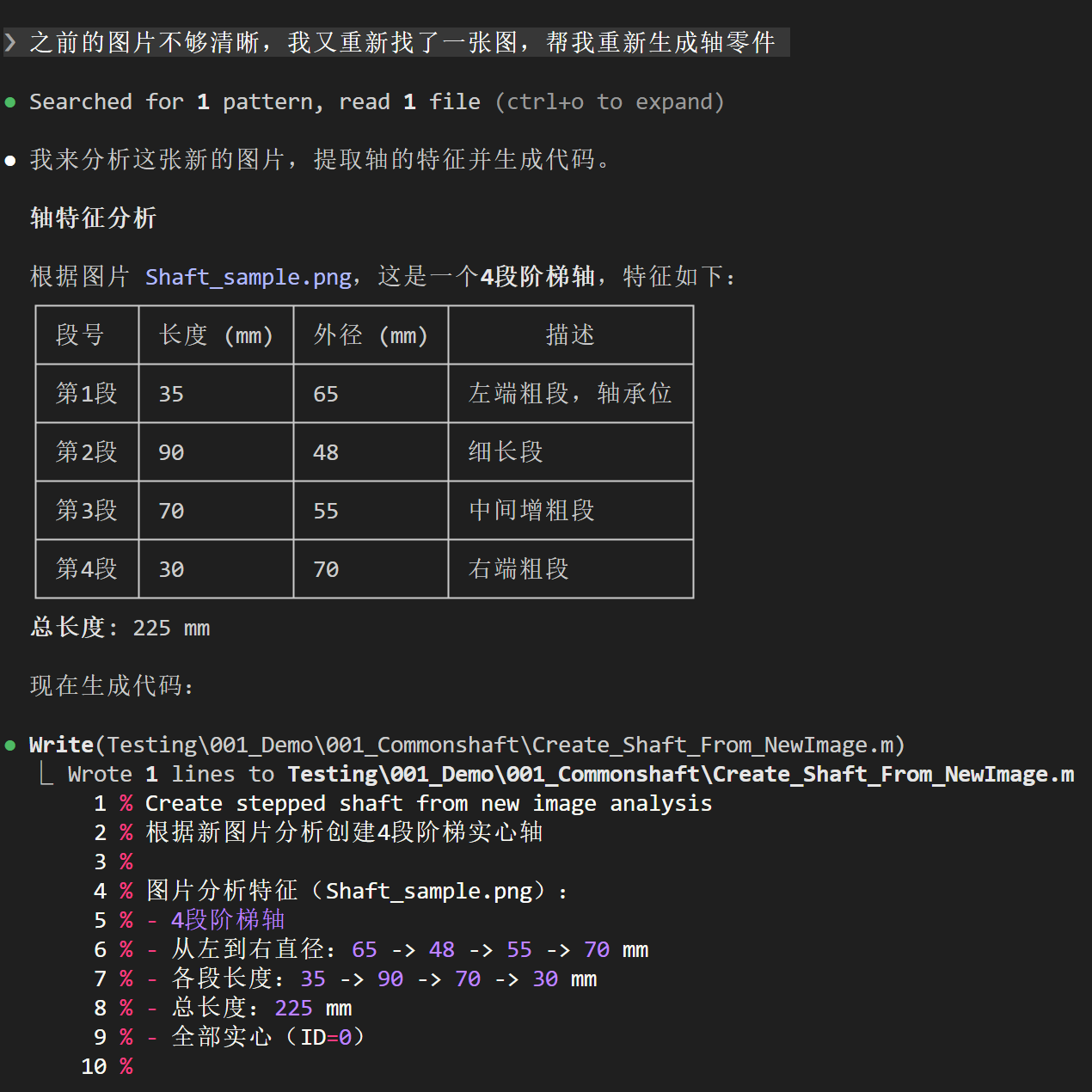 形成skills后,我告诉AI, 生成一根长500mm, 直径为50mm的轴